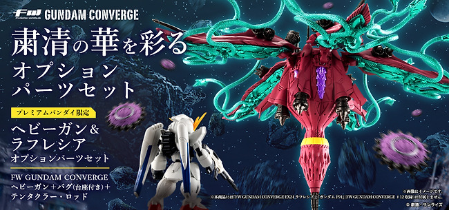 A. 개요2018년 11월 반다이 식완 신제품, 'FW GUNDAM CONVERGE 헤비건 & 라플레시아 옵션 파츠'을(를) 소개합니다. · 제품명: FW GUNDAM CONVERGE 헤비건 & 라플레시아 옵션 파츠· 가격: 2,400엔 (소비세 미포함)· 발송일: 2018년 11월 예정· 등장 작품: 기동전사 건담 F91* 제품 관련 공식 정보의 출처는 "건담 식완 포털(링크)" 입니다.※ 반다이 식완 사업부의 출하 일정에 따라 발매 일정이 변경될 수 있습니다. B. 제품 설명FW GUNDAM CONVERGE 시리즈로 출시되는 대형 MA 「라플레시아」를 더 즐기기 위한 옵션 파츠가 프리미엄 반다이 한정으로 발매!지구 연방군의 주력 범용기 「헤비건」을 포함하여, 라플레시아의 촉수이라고도 말할 수 있는 텐..